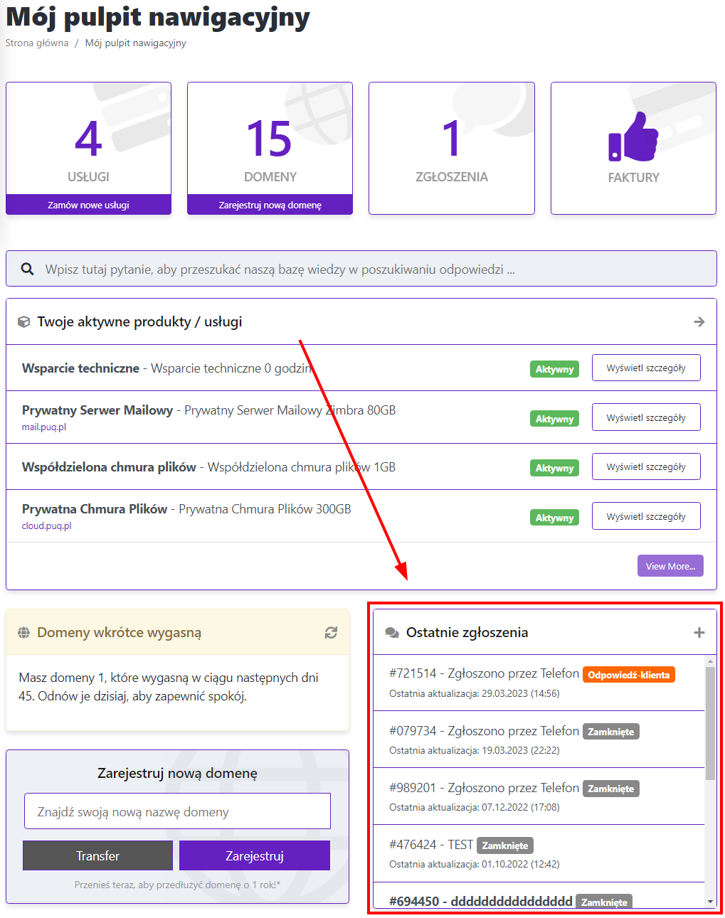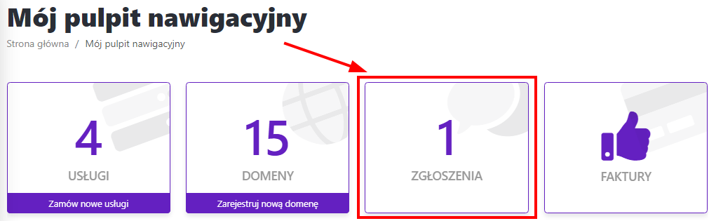 Na panelu obszaru klienta kliknij "Zgłoszenia"