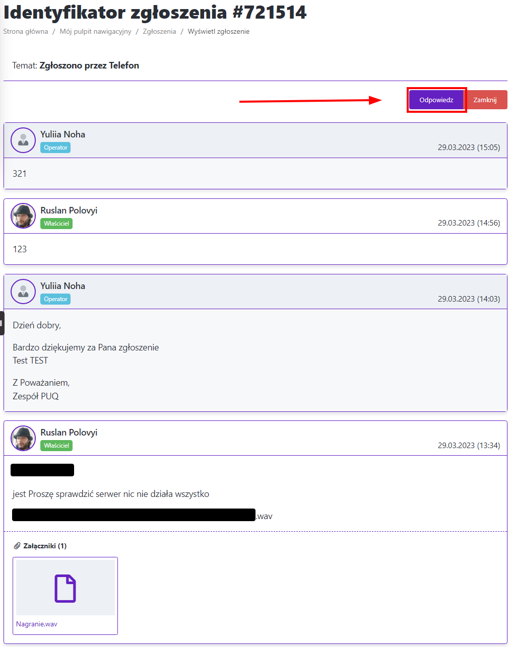 Sprawdź historię zgłoszenia (najnowsze wiadomości są na górze historii) i kliknij "Odpowiedz"