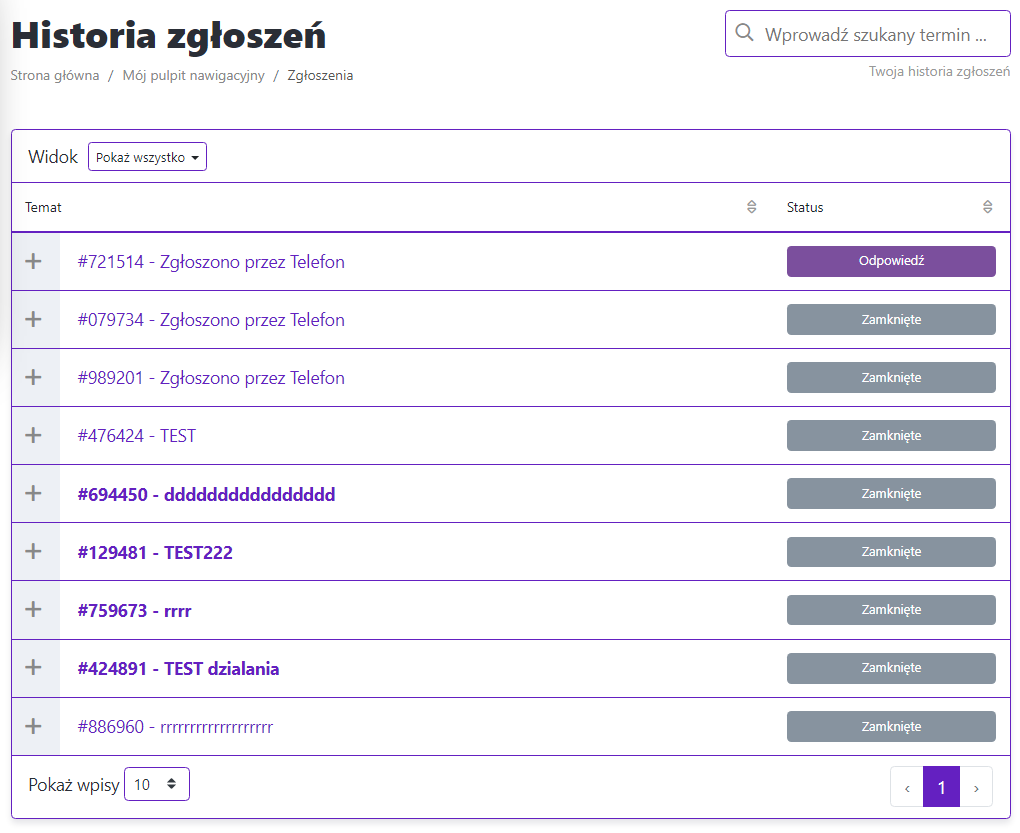 Wtedy wyświetli się historia twoich zgłoszeń