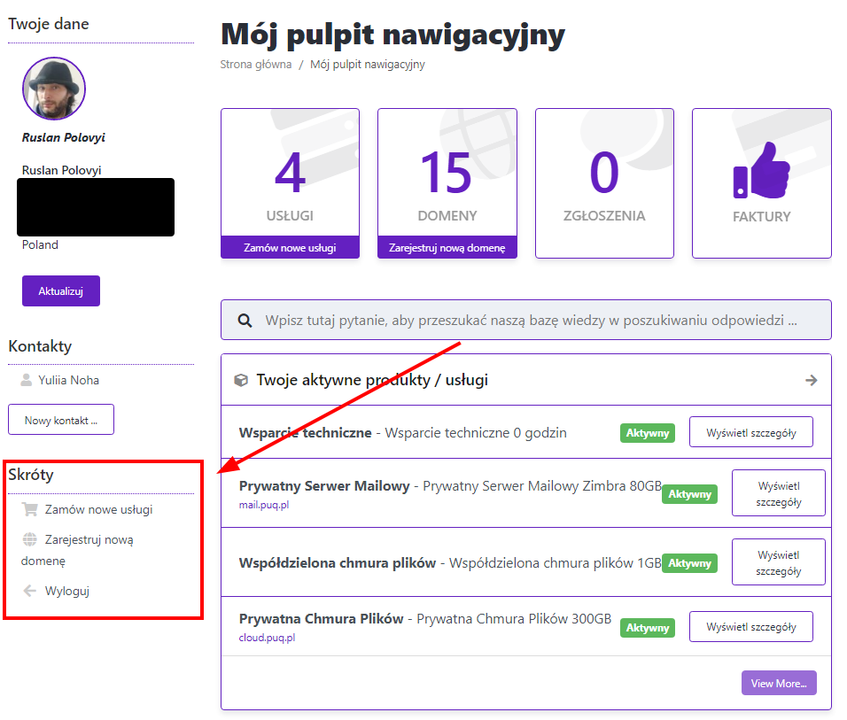 - Jeśli potrzebujesz hostingu, który będzie zarządał stroną i DNS kliknij "dodać" i zamów hosting. Jak zamówić usługę?