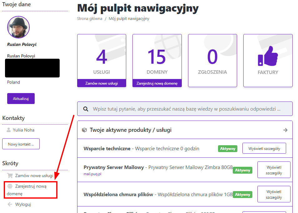 - Kliknij "Zarejestruj nową domenę"