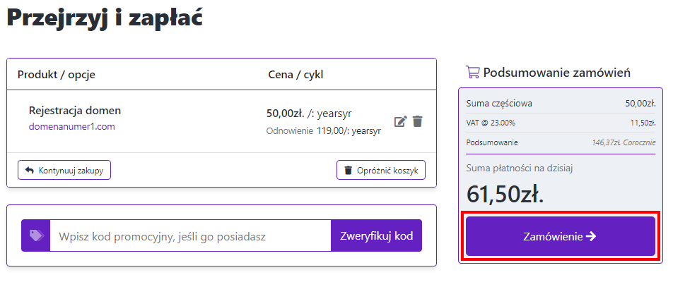 - Sprawdź swoje zamówione produkty, wpisz, jeśli masz, kod promocyjny i kliknij "Zamówienie"