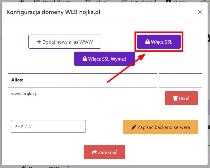 - Aby włączyć certyfikat SSL, kliknij "Włącz SSL" i poczekaj, aż się załaduje
