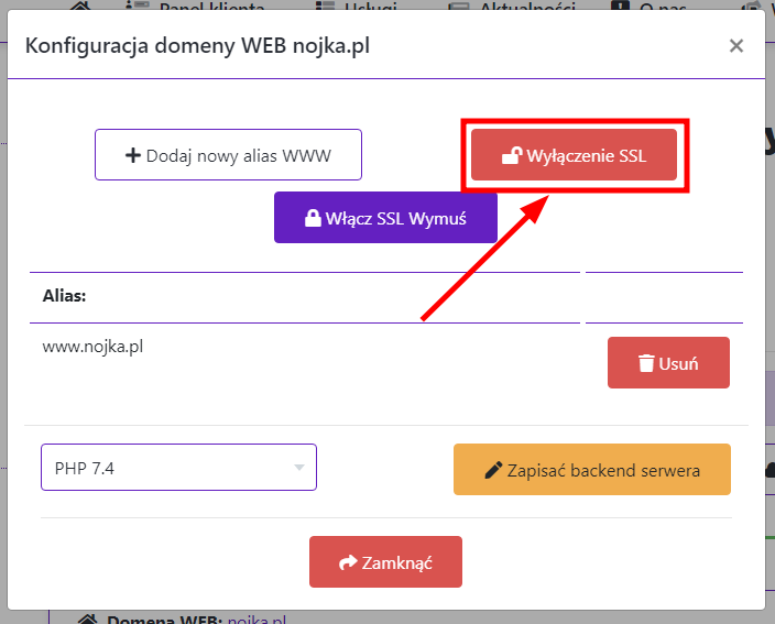 - Możesz go wyłączyć, klikając "Wyłączenie SSL"