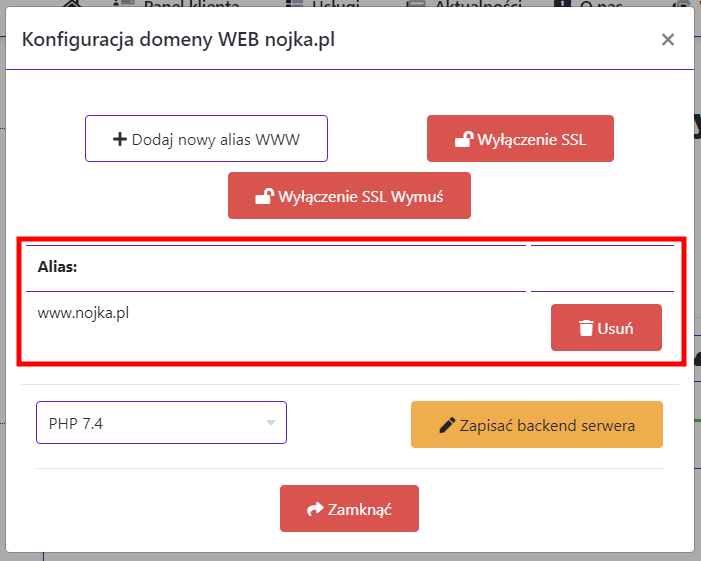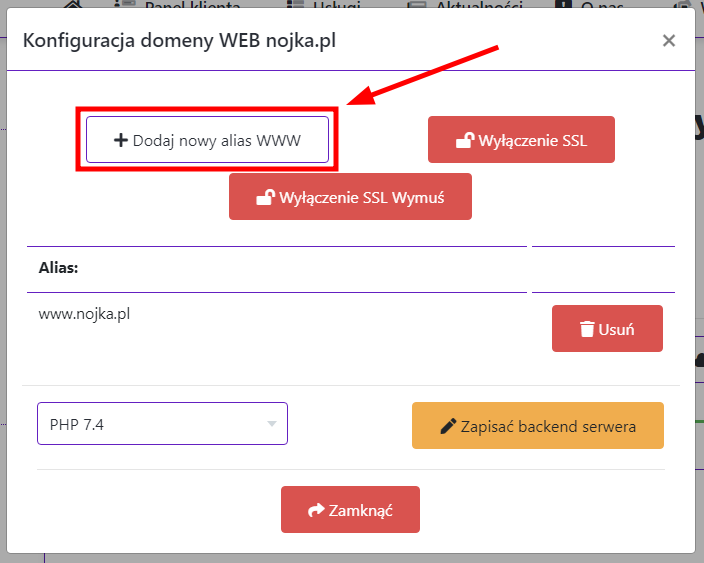 - Aby utworzyć alias, kliknij "Dodaj nowy alias WWW"