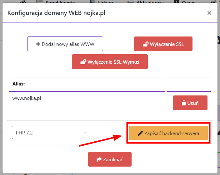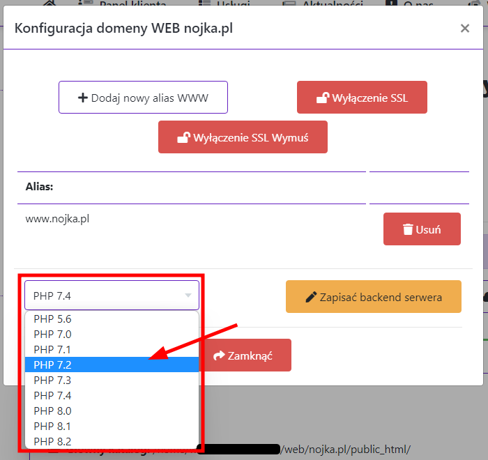 - Wybierz wersję PHP, na której chcesz zapisać backend serwera