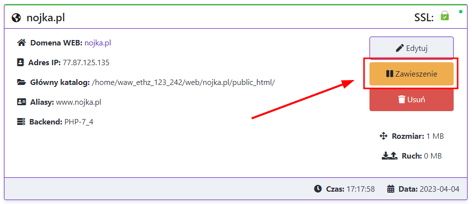 Możesz zawiesić usługę, klikając "Zawieszenie"