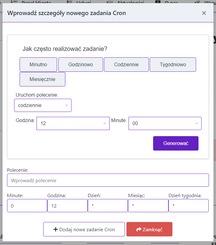 Aby skonfigurować zadanie CRON kliknij "Dodaj nowe zadanie Cron"
